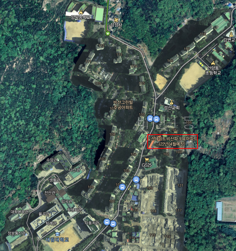 갈색 모자를 쓰고 있는 건물이 비산 파크뷰이고 우측에 보이는 아파트는 구축 임곡 그린빌 아파트(2005년 입주)입니다.