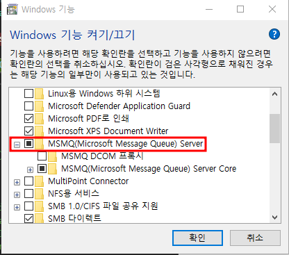 MSMQ는 윈도우 OS에서 제공하는 Microsoft Message Queue 입니다. 이를 사용하기 위해서는 제어판 > 윈도우 기능 켜기/끄기에서 활성화 해주셔야 합니다.