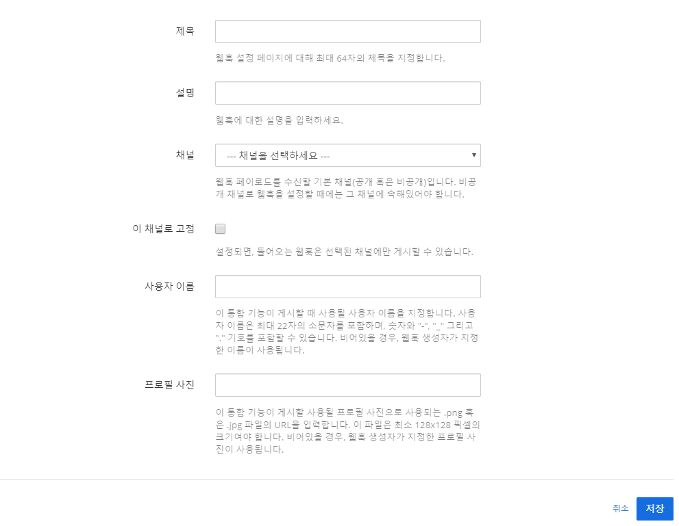 사용자 이름은 채널에 메시지가 추가될 때 사용하는 이름입니다. 적당하게 넣어주세요.