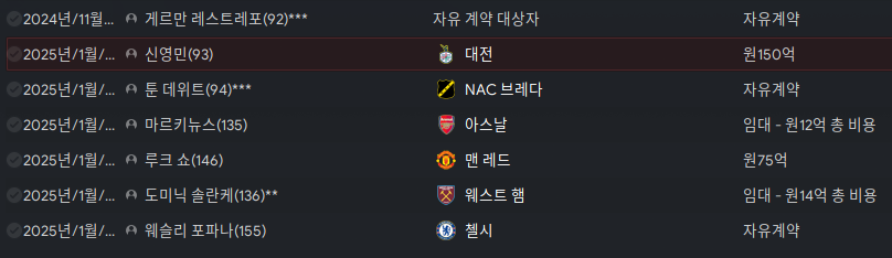 게르만, 신영민, 툰 데위트는 가상 잠재능력 170 이상 선수들이다. 이 게임하면서 대한민국 선수 중 180 잠능을 가진 선수는 처음인 것 같다. 그래서 최대 가격으로 데려왔다.