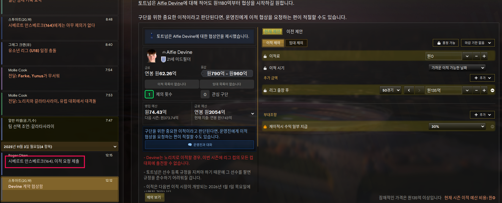 이유는 미드필더 주전인 만스베르크가 그간 내가 선수들과 약속을 지키지 않았다는 이유로 이적서를 제출했다.