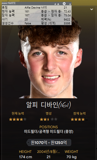 1. 알피 디바인: 토트넘 유망주로 잉글랜드 선수다. 아래 그림을 보면 나이도 엄청 어리다. 이번 게임에서는 잠능도 잘 받은데다가 토트넘에서 잘 컸는데 리그 순위가 낮아서 이적서를 요청한 것을 데려온 상황.. ㅋㅋ 그래서 토트넘 강등위기닷