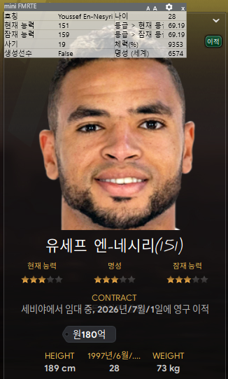 2. 유세프 앤-네시리: 지난 게임에 이어 또 영입했다. 공격수 들이 자꾸 부상을 당해서 윙어들이 격수역할을 하는 상황이라 공격수 영입이 절실했는데 돈이 없어서 완전영입이 포함된 임대이적으로 데려왔다.
