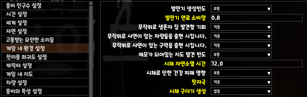 오전 9시 ~ 오후 9시까지는 느리게 움직이는 좀비.. 그래서 시작하자마자 2시간 동안은 빠르게 움직이는 좀비에 적응하기 위해 이렇게 설정해봅니다.