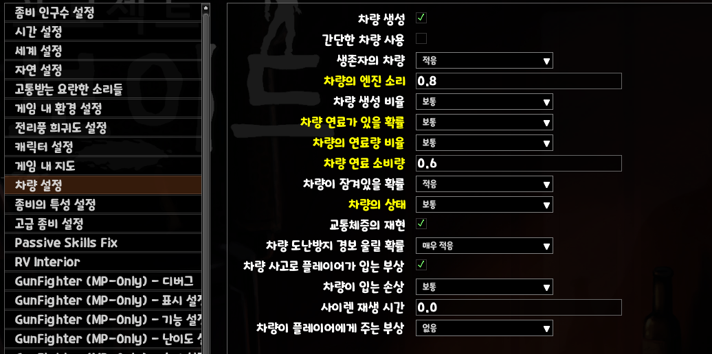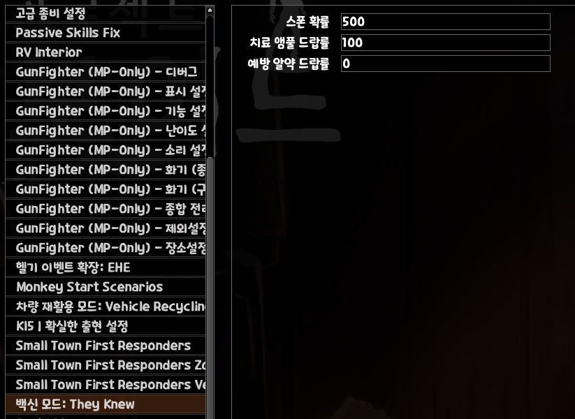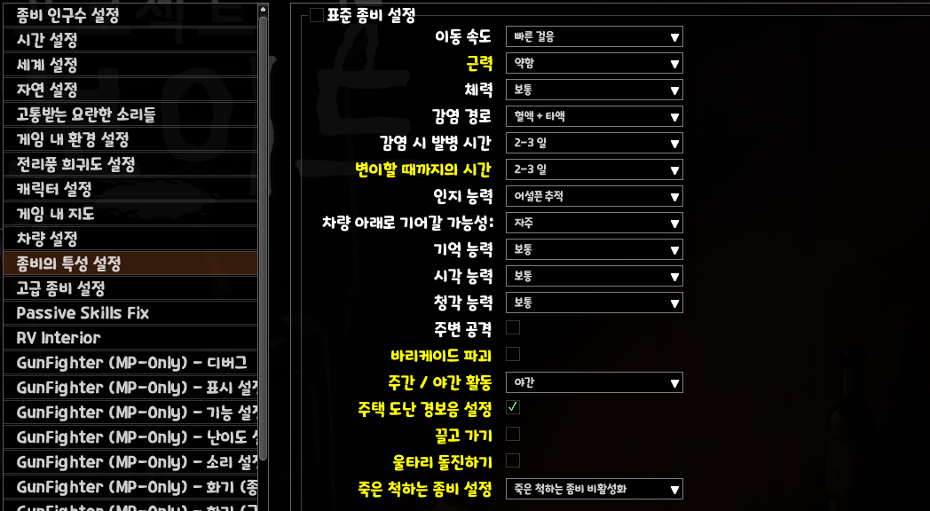변이할 때까지 시간은 주인공이 어떤 요인으로 감염이 됐을 때까지의 시간입니다. 좀비백신 모드도 설치되었기 때문에 백신약 구할 때까지의 시간을 벌기 위함입니다. (기본은 즉시입니다.)