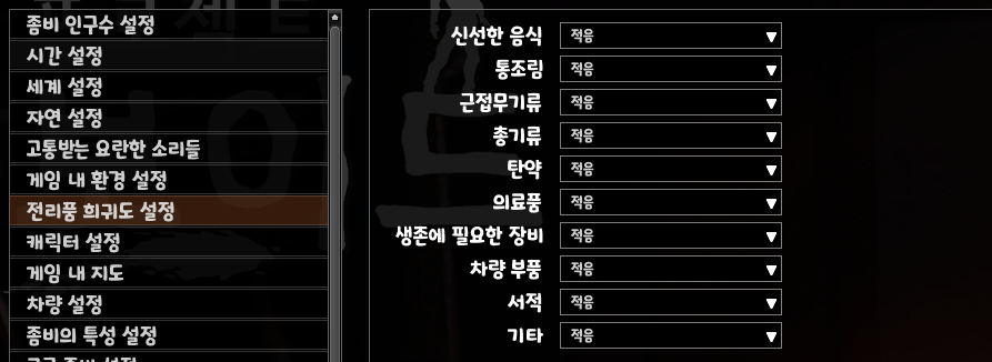 건물 문 잠겨있을 확률은 매무 많음에서 보통으로 설정했습니다. 나머지는 기본...