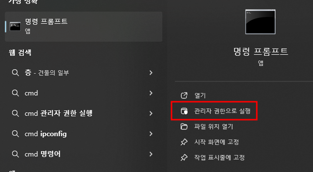 저는 시작 버튼을 누르고 나온 메뉴에서 "cmd"를 입력합니다.