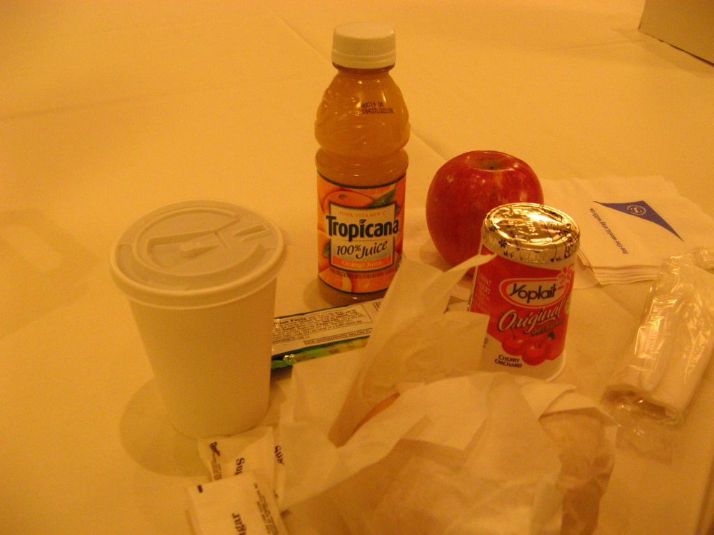 베이글에 스크램블.. 맛이 안 난다. 사과 하나, 주스, 요플레, 비스킷, 거의 반만 먹고 버렸다. 너무 많이 줘.. T_T