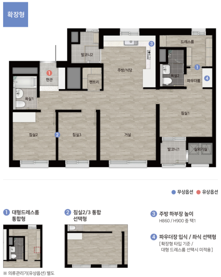 확장형은 베란다 확장을 말하는 건데 기본 포함가격입니다. 이 역시 요즘 아파트들 보면 확장 비용이 별도로 내야 하죠.